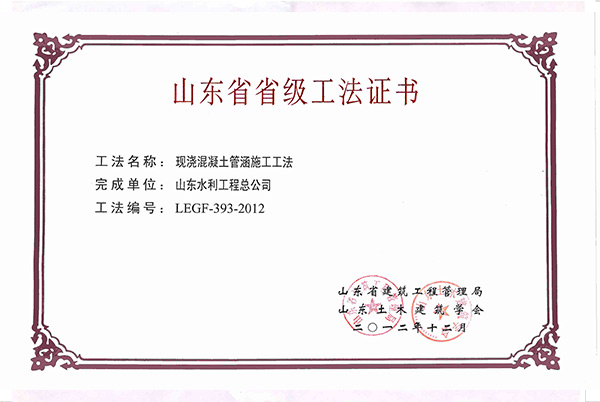 公司“现浇混凝土管涵施工工法”被评为2012年山东省省级工法