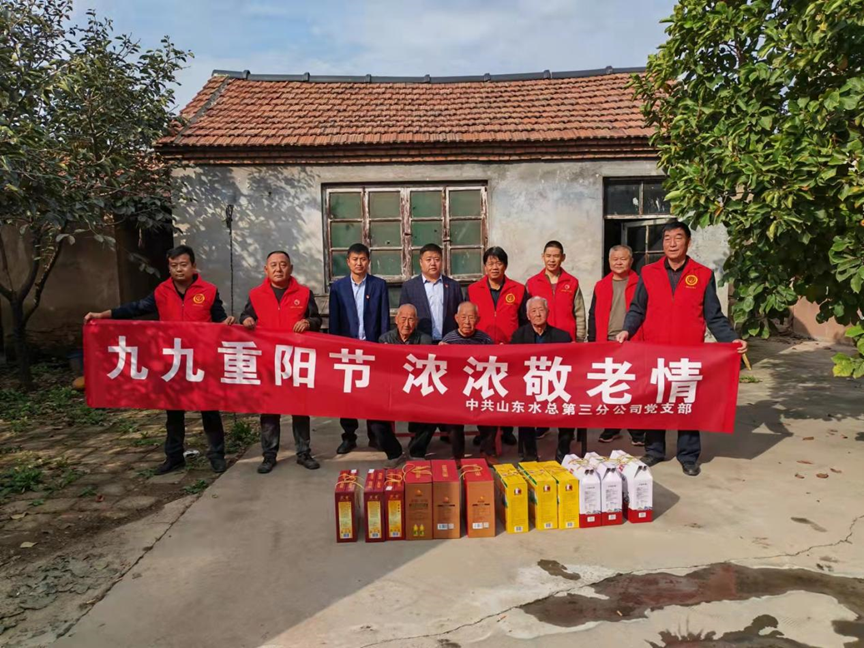为弘扬中华民族尊老敬老的光荣传统,10月14日重阳节这天,第三分公司副总经理杨绪辉、王庆捷一行前往开云手机站官方版网站登录入口邹平市孝妇河提升改造工程施工4标项目部所在地,在高书记带领下看望东吕村的老党员们,为他们带去公司党委的关怀和温暖,送去慰问品并致以节日的问候和祝福。杨绪辉同老党员们亲切拉家常,详细询问了老党员们的生活情况和身体状况,嘱咐他们一定要保重身体,对他们为国家、为社会做出的贡献表达了崇高敬意。
