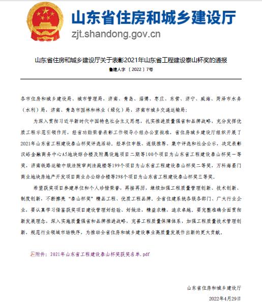 近日,山东省住房和城乡建设厅对2021年度“山东省工程建设泰山杯奖”获奖工程进行表彰通报,公司参建的2项工程榜上有名,其中“沂水县跋山水库除险加固工程”获得二等奖,“南水北调东线一期工程济宁市续建配套工程”获得三等奖。